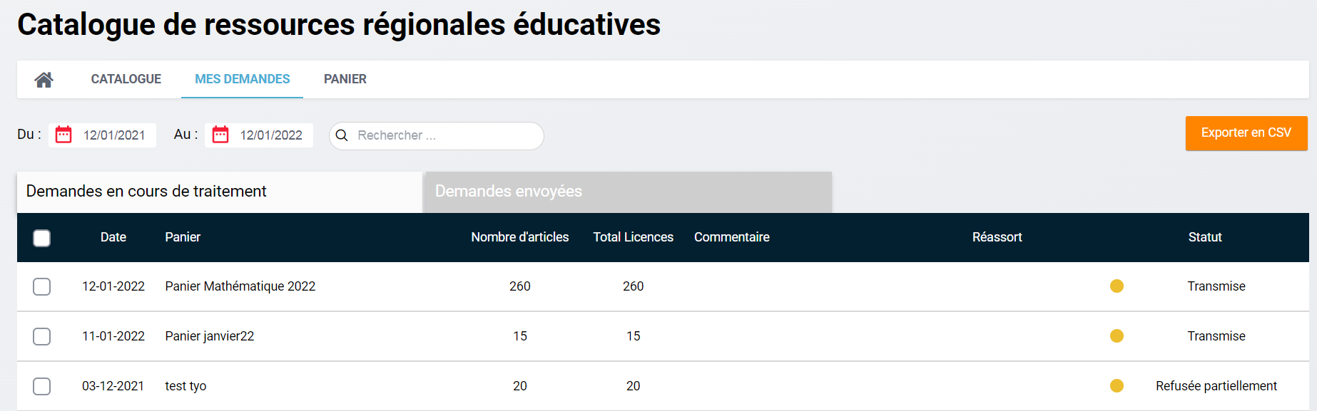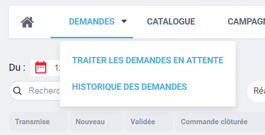Demandes envoyées quand la commande a été passée à l'éditeur. C'est ici que le valideur pourra suivre le statut des commandes.